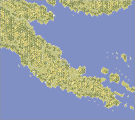 Původní bitva - mapa relativně věrná, bylo nutné provést jen pár kosmetických úprav a trochu oblast zahornatit a zalesnit dle skutečnosti. Z důvodu velikosti byla horní část oříznuta - Nová Británie na severu byla stejně v době vylodění na Nové Guinei již Japonci obsazena. Protože tato bitva v kampani přímo navazuje na bitvu Coral Sea, kde je hlavním cílem Port Moresby, je tento důležitý přístav v této bitvě v Japonských rukou.Mapa scenaria: